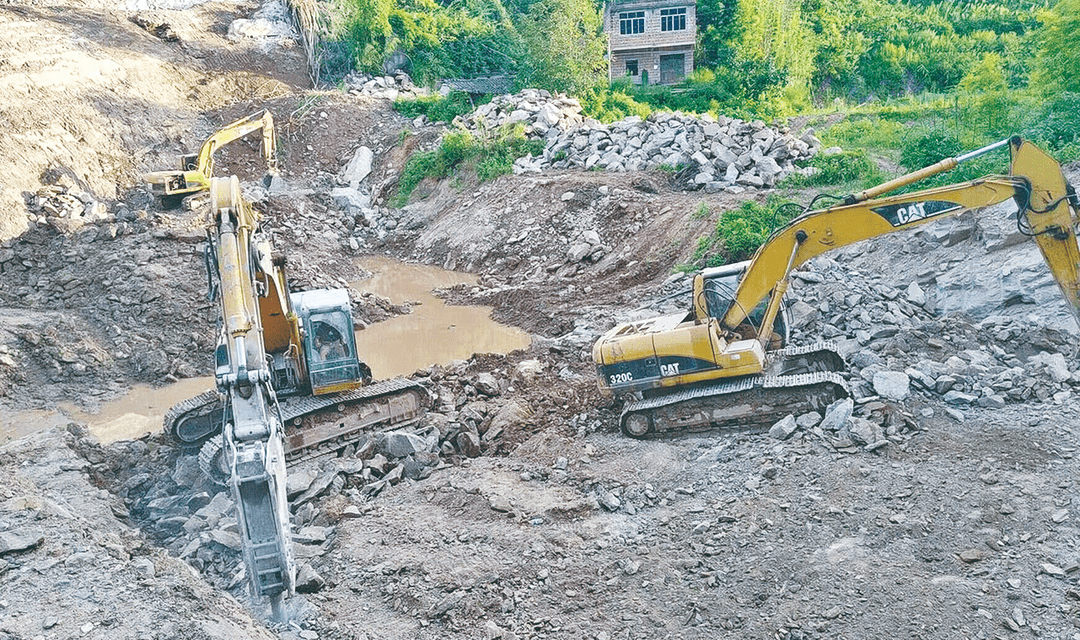 两台挖掘机正在对水库坝