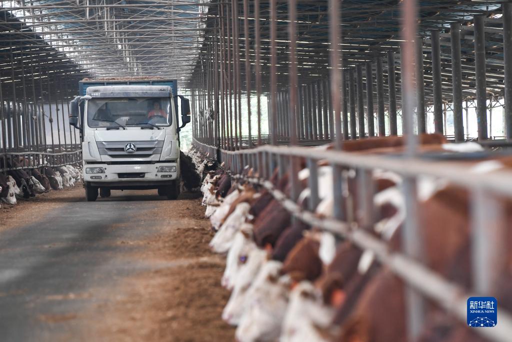 10月23日,在重庆市丰都县高家镇厚池坝村肉牛育肥场,工作人员驾驶撒料车给肉牛投料。